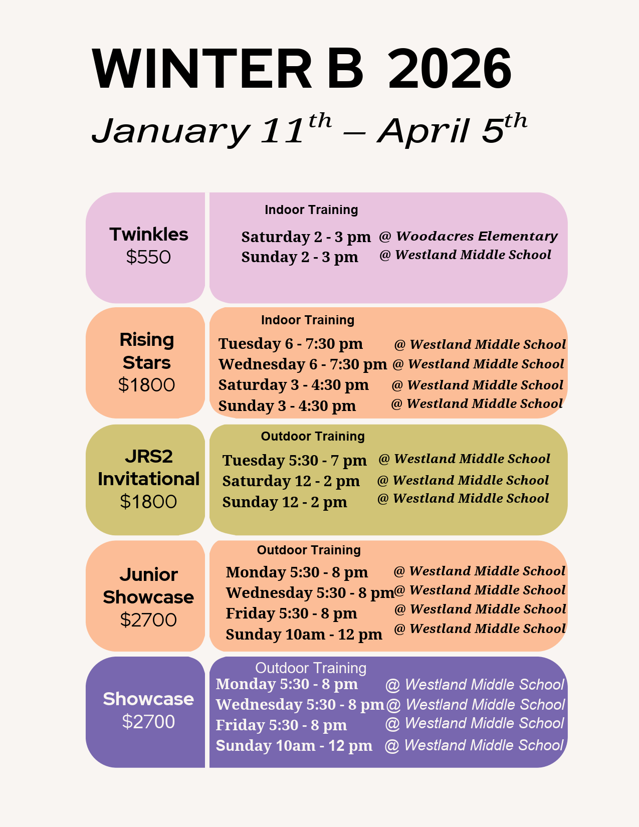 Sunday January 11th - Sunday April 5th (12 weeks)